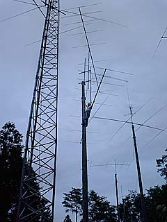 | 台風後始末のANT工事に加え、スリリングなcondxとなり、久々にミッチリと楽しんだ週末でした。 0530 起床 0650 山に向け出発 0745 山到着 無線機セッティングし台風でエレメントもブームも向きがてんでバラバラになった28M4elx2を直し、ついでに7M3elの向きも修正。そうこうしている内にタワー上で開始時間を迎え、 0915 とりあえず28M4elx2で運用開始。NAはAZのみ。 1250 一段落したので草刈で切断した28M5elの同軸交換。8D2V200m巻は腰が抜けそうな重さ(40kg)で背筋と上腕筋の絶好のトレーニング。ついでにコン柱足場とマスト足場を追加してアンテナ高を1mほど上げる(17m位?)。 1330 stack match を使って2系統のANTで運用再開 1530 ほとんど呼ばれなくなったのでスタックのtopとbottomを別給電できるように8D2Vをタワーに取付゙。一応1/2λxNに調整。これまた腰が抜けそう。 1600 日没が近づいたので作業を一旦中断し運用再開するが、低調なcondx。EUはUzoneとSP/LP1局ずつのYUのみ。日没後はTV見ながら周辺機器の整備。珍しくお山で休肝日。指輪物語を観て寝袋へ。 0645 起床 歯磨、洗顔