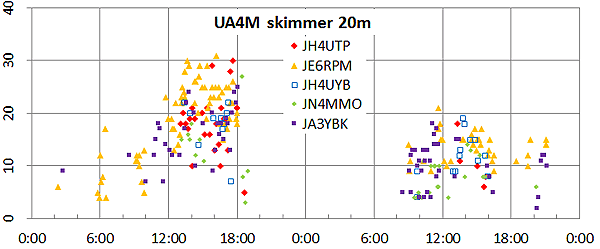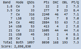< RBN > JA 10m 15m 20m 40m 80m 160m total -------- ---- ---- ---- ---- ---- ---- ----- JA3YBK 344 2066 4984 6682 3722 926 18724 JE6RPM 81 1047 2443 3725 278 5 7579 JH4UYB 15 501 2306 3394 796 79 7091 JE2YRB 1 541 2367 3234 674 29 6846 JR2GRX 27 599 2052 3307 768 51 6804 JA7ZFN 50 358 1882 2741 676 17 5724 JA6SHL 1 5044 1 5046 JA0QNJ 4 195 1789 2020 518 72 4598 JS3CTQ 6 348 1384 1923 134 22 3817 JH4UTP 8 3782 1 3791 JE1LFX 4 227 1889 1289 52 3461 JN2AMD 15 206 1070 1592 384 26 3293 JN4MMO 2810 2 2812 JR4OZR 115 875 1540 124 2654 JA6LCJ 2588 2588 JF2QNM 7 163 922 1083 329 2504 JQ1ABC 86 1024 706 317 34 2167 JH8SLS 1 101 1021 779 98 1 2001 JA1BJI 32 309 769 658 215 1 1984 JA1PNA 1 1203 676 3 1883 JA1ZGP 166 420 1037 239 1862 JA5FDJ 1806 1806 |